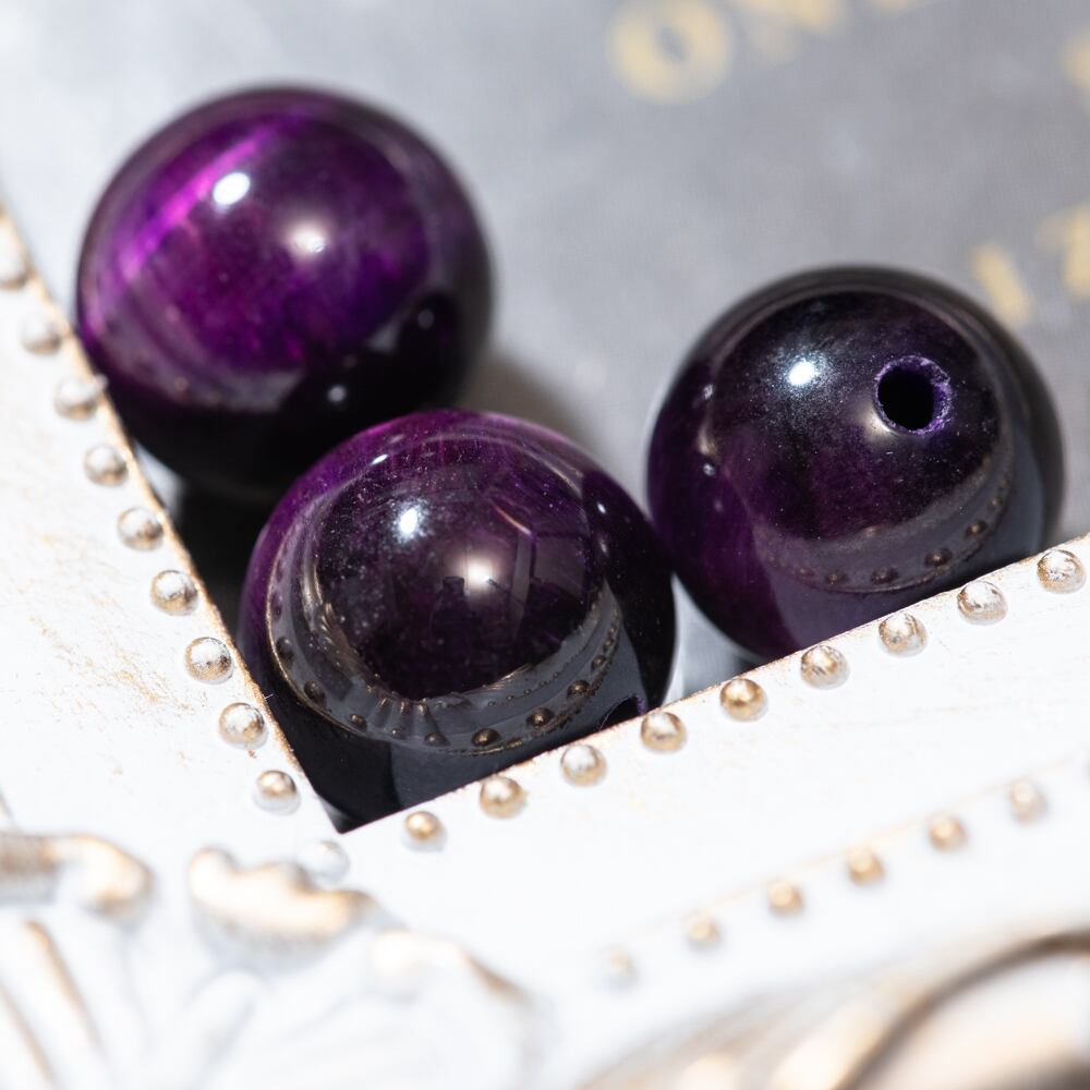 SSS パープルタイガーアイ 虎目がより濃い 紫虎目石 紫色 パワーストーン 天然石【パールクリエイト】10ミリ3粒 両穴 穴あり クリスタル 高級 ハンドメイド ブレスレット S45 | パールクリエイト